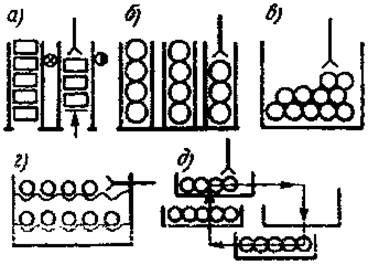 = 3..5° (рис. 8, к). Для каждой конкретной заготовки и способа ее перемещения производится подбор угла наклона конвейера с учетом допустимой скорости соударения деталей, при которой на поверхности их (при ударах) не образуются дефекты в виде забоин, вмятин и пр.