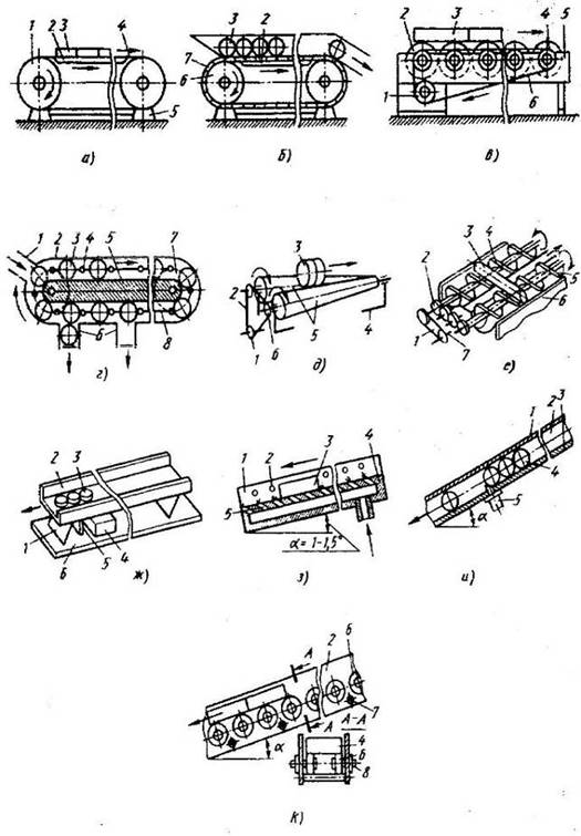 предназначены для гравитационного перемещения заготовок качением по роликам или скольжением по наклонной (в большей части прямой) поверхности длиной 2..5 м и более (рис. 8, и, к). Угол наклона конвейеров устанавливается в зависимости от способа перемещения заготовок, их массы и материала. При перемещении деталей качением
