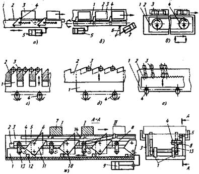 Конвейеры прерывистого действия. Шаговые конвейеры наиболее распространены и бывают двух типов: с убирающимися собачками (рис. 9, а) или поворачивающимися захватными устройствами (рис. 9, б). У первого типа конвейеров заготовки (спутники) перемещают по направляющим захваты в виде подпружиненных храповых собачек, укрепленных на осях в штанге, совершающей возвратно-поступательное движение с помощью гидравлического цилиндра. При движении штанги вперед собачки упираются в заготовки и перемещают их на шаг. При обратном ходе собачки утапливаются в штангу и проходят под заготовки, не передвигая ее. Основным недостатком конвейера является засорение стружкой храповых собачек.