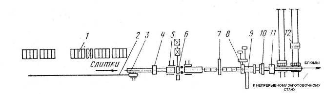 1- нагревательные колодцы; 2- челночная слиткоподача; 3- приемный рольганг; 4- весы для слитков; 5- манипулятор с кантователем; 6– рабочая клеть блюминга 1150; 7- сталкиватель обрезков; 8- ножницы усилием резания 16 т; 9- конвейер для уборки обрезков; 10- клеймовочная машина; 11- весы для блюмов; 12-устройство для уборки блюмов.