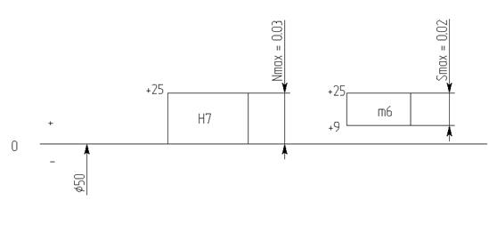 По номинальному размеру и полям допусков, пользуясь данными [3, таблицы А.2 и А.3], находим значения предельных отклонений посадочного отверстия втулки Ø50H7 и посадочной поверхности вала Ø50m6: