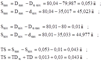 Исходя из назначенных посадок, определяем значения предельных отклонений (пользуясь данными [3, таблицы А.1 – А.4]), допуски размеров, предельные значения и допуски зазоров или натягов: