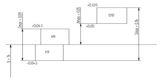 Определяем натяги и зазоры между пазом втулки и шпонкой 14D10 (+0,120; +0,05)/ h9 (0; -0,043):