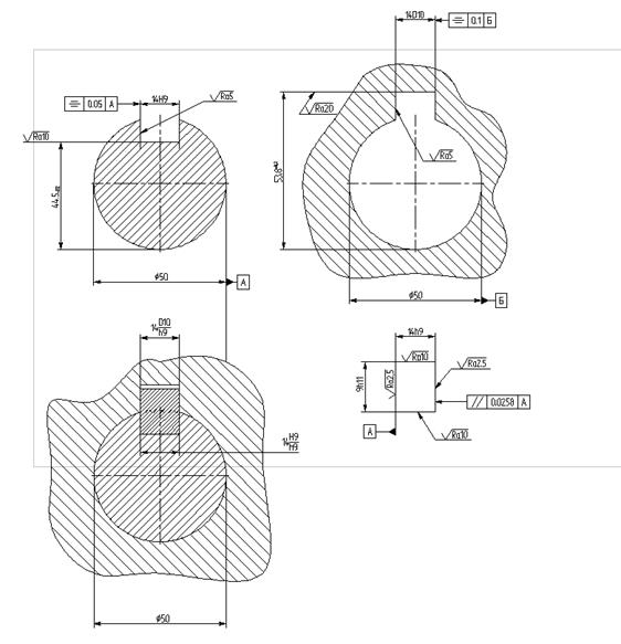 Для сборки важно правильное расположение канавок (пазов) на валу и во втулке. Поэтому назначаются такие нормы, как допуски симметричности оси канавок (пазов) относительно оси вала и относительно оси отверстия втулки и допуск параллельности плоскости оси канавки к оси вала или отверстия.