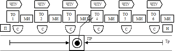 ТО – технологическое оборудование; ЧПУ – устройство числового программного управления; МИ – магазин инструментов; С – стол для деталей; ПР – подвижной промышленный робот; Тр – трасса ПР; П – питатель заготовками;