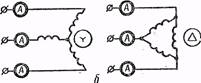 Метод токов (рис. 7,б) заключается в измерении величин токов в проводах, подводящих питание к электродвигателю. При соединении обмоток статора в звезду наибольший ток покажет амперметр, включенный в фазу с междувитковым замыканием, а при соединении обмоток в треугольник — амперметры, между которыми включена поврежденная фаза. При указанных измерениях в электродвигателях с фазным ротором цепь ротора должна быть разомкнутой.