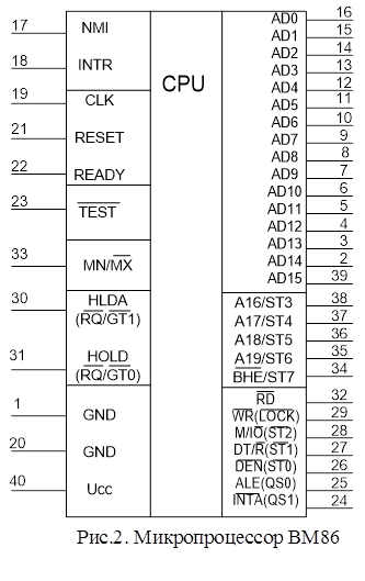 Микропроцессор К1810ВМ86 представляет собой однокристальный 16-битовый МП работающий в данной вычислительной системе в минимальном режиме. Этот модуль производит чтение ПЗУ, а также чтение и запись в порты ввода-вывода. Условное графическое обозначение МП К1810ВМ86 приведено на рис.2. Опишем его выводы, используемые при проектировании системы.