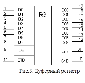 Буферный регистр представляет собой 8 - разрядный параллельный регистр с тристабильными выходами и используется для организации адресных защелок и портов ввода - ввода. Графическое обозначение приведено на рис.3. Опишем назначение выводов этой микросхемы.