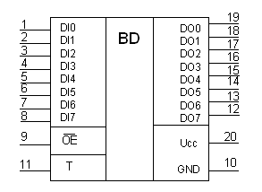 DI7- DI0 - вход/выход линий данных. В зависимости от состояния входа Т они могут быть входными, если на Т сигнал высокого уровня, и выходными, если на Т сигнал низкого уровня;