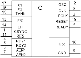 Генератор тактовых импульсов предназначен для управления ЦП К1810ВМ86 и периферийными устройствами. Графическое изображение микросхемы приведено на рис.5. Опишем используемые ее выводы.