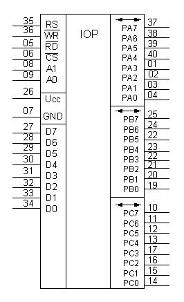 - запись. Низкий уровень сигнала разрешает запись информации с шины D7. D0 в порт микросхемы, адресуемый по входам А0 и А1;