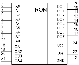 ППЗУ представляет собой микросхему, предназначенную для хранения программы, которую пользователь может самостоятельно записать в нее. Операция программирования заключается в разрушении плавких перемычек на поверхности кристалла импульсами тока. Матрица до программирования, то есть в исходном состоянии, содержит однородный массив проводящих перемычек, соединяющих строки и столбцы во всех точках их пересечений. Программу в ППЗУ мы записывать не будет, предполагаем, что она уже находится там. Эта микросхема содержит 512 байт, а время выборки адреса 50нс, что на много меньше 200нс (время одного такта). Микросхема представлена на рис.7. Опишем используемые выводы.