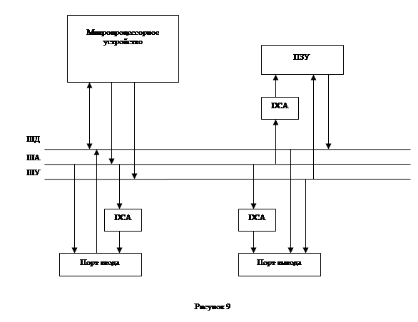 Микропроцессорное устройство состоит из самого микропроцессора, генератора тактовых импульсов, а также из буферных регистров и шинных формирователей. Последние два элемента используются для демультиплексирования шины адреса/данных. Здесь рассматриваются все эти элементы как один блок, из-за того что при построение любой системы на базе К1810 эти элементы всегда должны в него входить. Системную магистраль разделим на шину адреса, шину данных и шину управления. К ним подключим наш обобщенный блок, а также ПЗУ, порт ввода и вывода, которые необходимо присоединить при помощи дешифратора адреса. Дешифратор необходим для точного выбора микросхемы, чтобы не было путаницы при обращении в пространстве ввода/вывода и пространстве памяти, которые друг от друга отделены. Непосредственное взаимодействие используемых блоков с шинами показано с помощью стрелок, направленных к и/или от соответствующим шинам. Структурная схема устройства ввода приведена на рисунке 9.