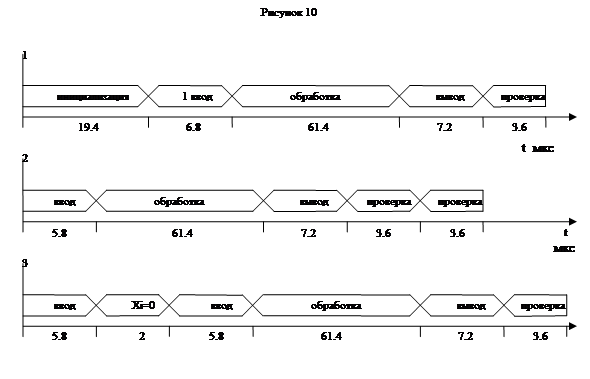 Наиболее интересные варианты представлены в виде временных диаграмм на рисунке 10. Но вначале надо определить, сколько времени занимает один такт. Частота такта равна 5Мгц, отсюда следует, что его продолжительность 200нс. Значит, чтобы подсчитать время, затраченное на обработку участка кода программы необходимо сложить все такты каждой из микроопераций и полученное значение умножить на 200нс. Количество тактов, за которое исполняется команда приведено в приложении (напротив каждой команды).