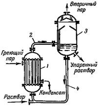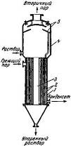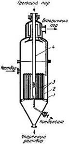 Выпарной аппарат с вынесенной греющей камерой состоит из нагревательной камеры (кипятильника) 1, представляющей собой пучок труб, сепаратора 3 и циркуляционной трубы 4, присоединенной к нижней растворной камере.