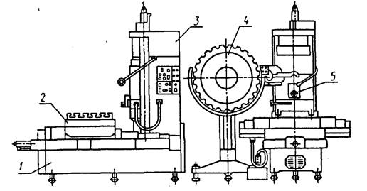 1— основание; 2 — стол; 3 — шпиндельная бабка; 4 — инструментальный магазин; 5 — шпиндель