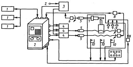 1 — аппаратура связи с ЭВМ верхнего уровня, периферийные устройства ввода-вывода данных; 2 — устройство с ЧПУ; 3 — станция питания; 4 — блок управления двигателями подачи и привода главного движения; 5 — двигатели приводов подачи и привода главного движения; 6 — измерительные преобразователи перемещений рабочих органов станка; 7 — кинематическая система станка; 8 — нормирующие и согласующие блоки измерительных каналов; 9 — измерительные датчики параметров ТП; 10 — сигнальные датчики фиксированных положений рабочих органов; 11 — рабочие органы пульта управления станка