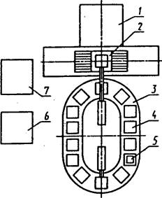1 — технологическое оборудование (станки типа ЛФ-260МФЗ 21103Н7Ф4, ИР-320); 2 — приемо-зажимное устройство; 3 — накопительно-подающее устройство; 4 — комплект приспособлений спутников; 5 — устройство для крепления деталей на приспособлениях-спутниках; б — устройство управления модулем; 7 — устройство связи системы ЦПУ станка с устройством управления модуля