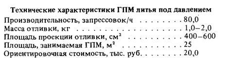 Особенности и основные факторы, определяющие типовую компоновку ГПМ литья под давлением (и его возможные модификации) обусловливаются серийностью и номенклатурой отливок, технологическим циклом и параметрами получения отливок на машинах литья под давлением (МЛД), видов применяемых ПР для заливки металла, смазки пресс-форм и пресс-камер, способов снятия отливок после литья и обрубки. В зависимости от состава и принятых решений по разгрузке МЛД типовые ГПМ литья под давлением подразделяются на следующие исполнения: с применением горизонтальных или вертикальных прессов; со сбросом отливок в тару или на транспортер; с транспортерами-съемщиками, снабженными заливочными стержнями. Например, для автоматизации процесса изготовления отливок из цветных металлов и сплавов типовым ГПМ литья под давлением является модель 2 Л.