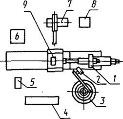 Рис. 2 - ГПМ литья под давлением: 1 - МЛД; 2 - ПР для заливки металла; 3 - печь раздаточная; 4 - система управления; 5 - стенд контроля технологических параметров; 6 - установка термостатирования; 7 - ПР для съема отливок; 8 - приемно-выдающее устройство (тара для отливок); 9 - устройство смазки