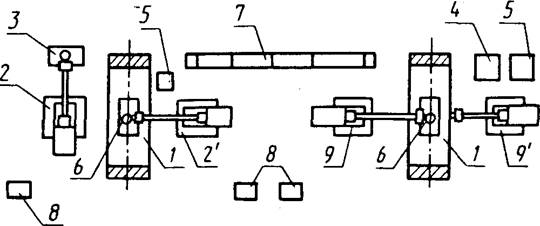 Рис. 5 - Структурная схема ГПЛ холодной штамповки на основе универсальных ПР: I - пресс двухстоечный; 2, У - ПР; 3 - подающее устройство; 4 - тара для штамповки; 5 - тара для высечки; 6 - штамп; 7 - роботизированная транспортная система (РТА); 8 - СПУ ПР- 99'-ПР.