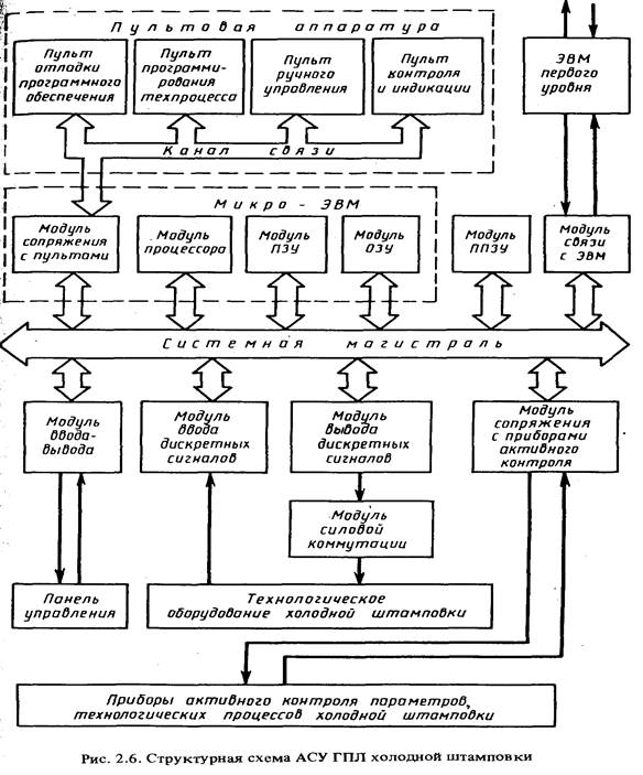 Автоматизированная система управления ГПЛ холодной штамповки (рис. 6) имеет двухуровневую иерархическую структуру, включающую: управляющую ЭВМ первого уровня (управление транспортно-накопительной системой и ЧПУ станков); ЭВМ (микро-ЭВМ), используемой в качестве локального устройства управления ЧПУ ПР и прессов. Система управления (см. рис. 6) ГПЛ холодной штамповки, построенная по модульному принципу, позволяет обеспечить гибкость, универсальность, возможность наращивания модулей, снизить затраты на проектирование и ремонт системы управления, повысить технологичность изготовления системы управления.