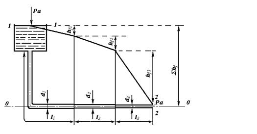 Якщо простий трубопровід складається з труб різного діаметру (мал. 3), то в цьому випадку загальна втрата опору Σhf розділяється нерівномірно по довжині трубопроводу, а п'єзометрична лінія є суцільною ламаною лінією.