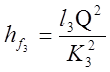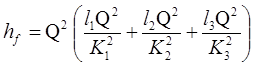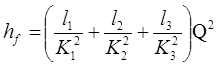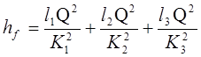 де hf1 , hf2 , hf3 – втрати опору по довжині на ділянці трубопроводу з довжинами l1 , l2 , l3 , діаметрами d1 , d2 , d3 і витратними характеристиками К1 , К2 , К3 .