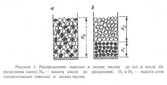 В гравитационных аппаратах и машинах разделение частиц происходит в разрыхленных слоях, в которых твердые частицы находятся во взвешенном состоянии, обусловливаемом воздействием на них жидкости, газа или вибрирующих твердых стенок. Толщина взвешенных слоев колеблется в широких пределах — от нескольких метров до миллиметров (концентрационные столы, шлюзы).