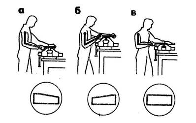 При низком расположении тисков предплечье образует с плечом тупой угол, мышцы предплечья сильно напрягаются, движение затрудняется, нарушается равномерность нажима правой и левой руками, спина сгибается. Так как при согнутой спине положение работающего неустойчиво, то он, стремясь сохранить равновесие, наклоняется вперед и усиливает нажим левой рукой. А это вызывает "завал" левого края обрабатываемой заготовки.