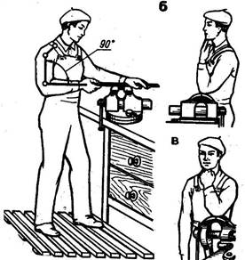 Рис.1--Положения работающего относительно тисков при опиливании: