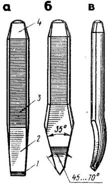 Зубило изготовляют длиной 100, 125, 160, 200 мм, ширина рабочей части соответственно равна 5, 10, 16 и 20мм. Рабочую часть зубила на длине 0,3...0,5 закаливают и отпускают. После термической обработки режущая кромка должна иметь твердость НRСЭ 53...59, а боек - НRСэ 35...45.