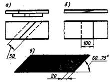 Рис. 2. Раскрой и склеивание шлифовальной ленты: а — встык под углом, б — внахлестку, в — шаблон для раскроя шкурки