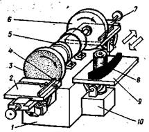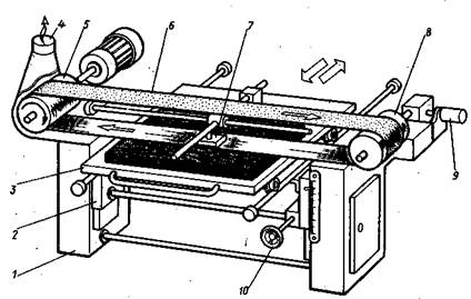 Рис. 3. Ленточный шлифовальный станок с подвижным столом: 1 — тумба, 2 — суппорт, 3 — стол, 4 — ограждение-пылеприемник, 5 — приводной шкив, б —шлифовальная лента, 7 — утюжок, 8 — неприводной шкив, 9 — пневмоцилиндр, 10 — маховичок