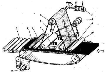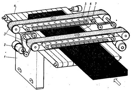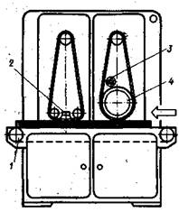 Рис. 4. Схема двухленточного шлифовального станка с конвейерной подачей ШлПС-9;