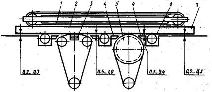 Рис. 7. Схема настройки широколенточного шлифовального станка: 1 — опорный стол, 2 — конвейерная лента, 3 — контактная прижимная балка, 4 — базирующие столики, 5 — контактный валец, 6 — опорный ролик, 7 — деталь
