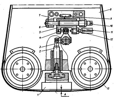 Рис. 8. Схема механизма настройки контактной балки шлифовального станка: 1 — утюжок, 2—шток, 3— вал, 4 — упор, 5—ползун, 6—шайба, 7 — корпус, 8 — кронштейн, 9 — линейка, 10, 11— винты, 12— гайка, 13— ролик