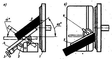 Если нужно шлифовать торец с наклоном к кромке детали (рис. 10, б), направляющую линейку 5 поворачивают на-требуемый угол и закрепляют зажимом 6. При шлифовании криволинейной детали с поверхностью, расположенной под углом к ее базовой плоскости, стол бобины наклоняют.