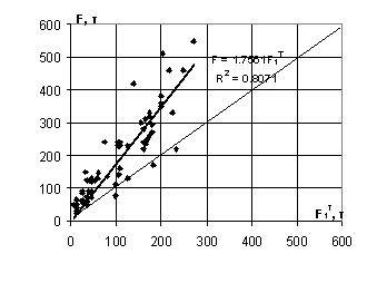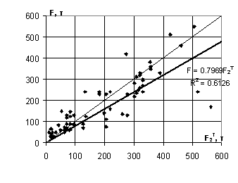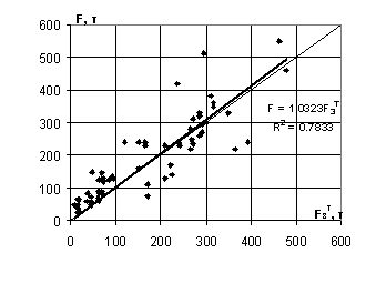 Следующая оценка выполнена для несущей способности F3 T , вычисленной в соответствии с гипотезой 3 (рис. 3). При этом коэффициенты формы фундамента принимались равными единице, в противном случае расчетная несущая способность оказывается существенно выше фактической. Такая методика расчета дала завышенный прогноз несущей способности в 25% случаев, однако существенная разница между расчетными и фактическими значениями имеется лишь в 5 случаях, т.е. в 7% рассмотренных случаев. Среднеквадратическое отклонение результатов расчета от фактического значения составляет 56 т. Корреляционная прямая практически совпадает с теоретической (k =1,032 при коэффициенте корреляции R=0,86).