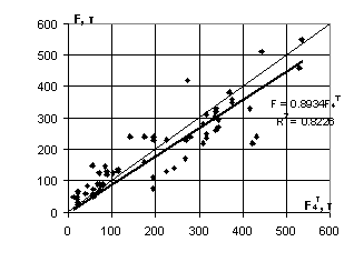 Прогноз несущей способности буровых свай без введения понижающих коэффициентов для расчетного сопротивления грунта по боковой поверхности F4 T (гипотеза 4) показал завышение по сравнению с фактической несущей способностью в 47% случаев (рис. 4). Фактическая несущая способность, в среднем, оказывается на 11% ниже рассчитанной на основании гипотезы 4 (k =0,893, коэффициент корреляции R=0,91) при среднеквадратическом отклонении 55 т от теоретической прямой.