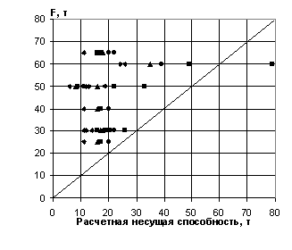 Рис. 1. Диаграмма соответствия рассчитанной несущей способности свай по гипотезе 1 и несущей способности, определенной на основании результатов статических испытаний