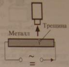 В ряде случаев металлы нагревают, пропуская через них электрический ток (рис. 2, в). Этот способ также не создаёт оптической помехи и эффективен при обнаружении трещин, расположенных перпендикулярно направлению линий тока. Применение такого вида нагрева создаёт проблему ввода в изделие мощных токов.