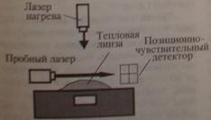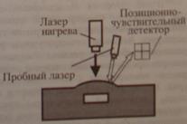 В лабораторных исследованиях иногда используют специфический способы тепловой стимуляции и регистрации температуры. Высоким температурным разрешением обладает техника «миража», которая предусматривает нагрев и регистрацию температуры с помощью лазера (рис. 2, и). Над дефектом создаётся область повышенной температуры прилегающего воздуха при прохождении через которую пробный луч лазера претерпевает отклонение, пропорциональные температуры и регистрируемые позиционно-чувствительным фотодетектором. Другой пример комбинирование техники НК показан на рис 2, к: при нагреве лазером слои материала, расположенные над дефектом, испытывают аномальные деформации, которые фиксируют с помощью второго (пробного) лазера и позиционно-чувствительного фотодетектора.