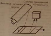 Компромиссным вариантом между поточечным сканированием и тепловизионным способом ТК является сорное сканирование: изделие нагревают в узкой длинной полосе, а температуру регистрируют срочно-сканирующим пирометром (рис.4, б). Проблемы равномерность нагрева решается проще, чем при распределённом нагреве, а производительность испытаний выше, чем при поточечном сканировании, приблизительно в N раз, где N – число элементов в строке. В этом случае зона нагрева перемещается по поверхности изделия, поэтому срочное сканирование