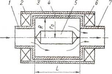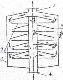 1 – патрубок для входу забрудненої рідини; 2, 6 – опорні підшипники; 3 – корпус очисника; 4 – ротор; 5 – центральне тіло; 7 – патрубок для виходу чистої рідини.
