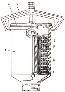 1 – корпус; 2 – кришка; 3 – траверси; 4 – трубчатий магніт; 5 – латунна трубка; 6 – феромагнітна вставка; 7 – шайба.