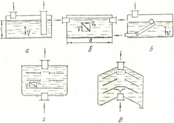 а – статичний очисник; б – динамічний прямоточний очисник; в-резервуар з верхнім пристроєм забору рідини; г – тонкошаровий ГО з плоскими тарілками; д – тонкошаровий ГО з конічними тарілками.