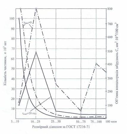 Результати дослідження показали, що при максимальному рівні забрудненості, який відповідає початковому моменту процесу відстоювання, найбільша частина розміром 10…25 мкм і складає близько 42% від загального об’єму, частинки 5…10 мкм – 7…8%, 25…50 мкм – 12%, 50…75 мкм – 3…4%, 75…100 мкм – 19% і вище 100 мкм – 16%. Тобто в початковий період відстювання найбільшу долю в загальному об’ємі забруднюючих частинок складають частинки розміром 10…25, 25…50, 75…100 і більше 100 мкм.