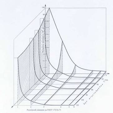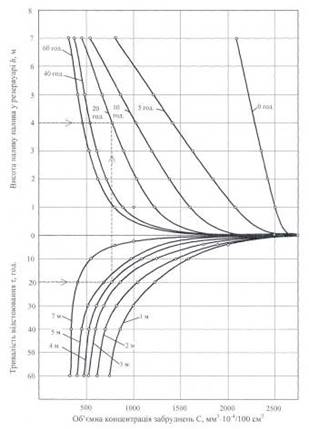 Отримані в результаті досліджень результати, приведені на рис. 3.5 дають можливість визначати рівень забрудненості палив на будь-якій висоті резервуару і при будь-якій заданій тривалості відстоювання палива. Для визначення цих параметрів, на основі аналізів статистичної обробки результатів, розроблена номограма.