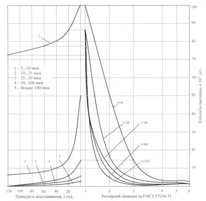 Рис. 3.3. Дисперсний склад механічних домішок авіа палива в залежності від тривалості його відстоювання